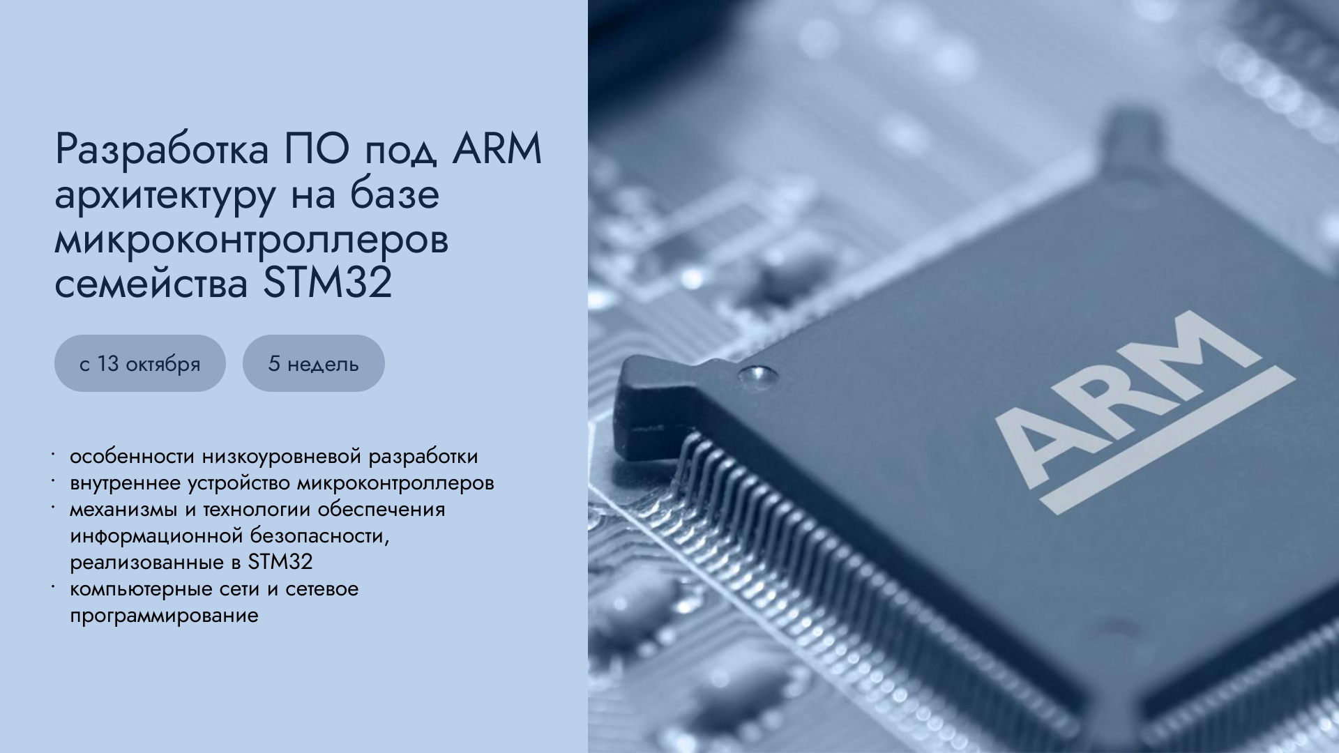 За следующие пять недель обучающиеся узнают об особенностях низкоуровневой разработки и подробно рассмотрят внутреннее устройство микроконтроллеров, в том числе познакомятся с механизмами и технологиям обеспечения информационной безопасности, реализованными в STM32.